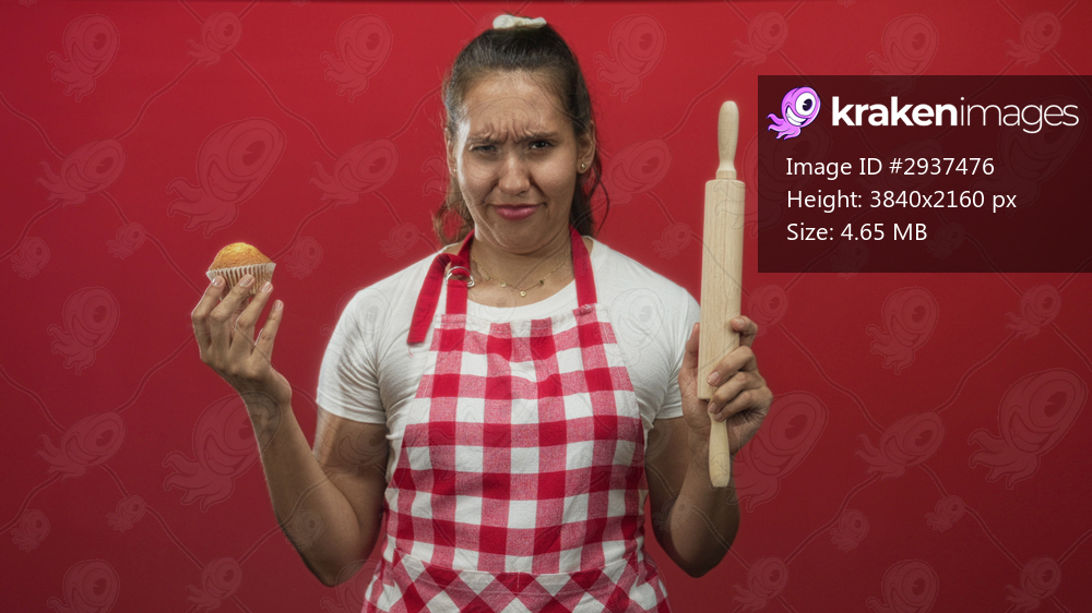 Woman cook wearing red checkered apron holding a rolling pin and a cupcake in studio with red backdrop; joy baking.