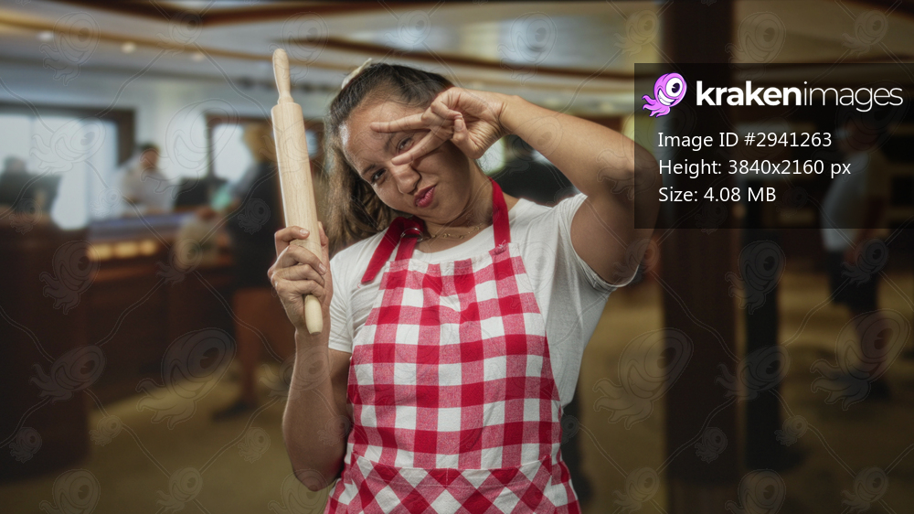Woman cook wearing red checkered apron holding a rolling pin and makes v sign to eye in hotel building; playful.