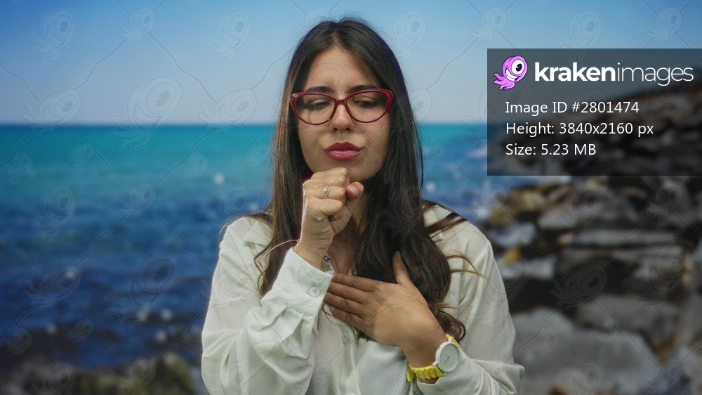 Woman coughing with closed eyes and hand on chest at seaside, wearing glasses, surrounded by ocean and rocks, shows health concern while standing outdoors in daylight. - Kraken Images