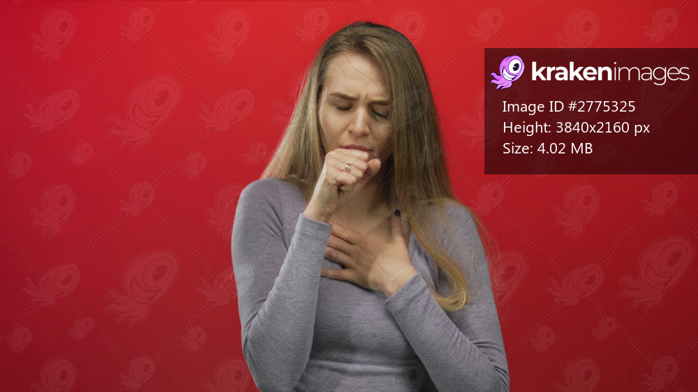 Woman coughing with hand on chest against vivid red background expressing discomfort and concern over health issues in an isolated setting, wearing casual gray attire. - Kraken Images