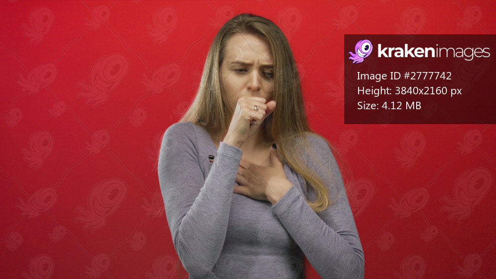 Woman coughing with hand on chest against vivid red background expressing discomfort and concern over health issues in an isolated setting, wearing casual gray attire. - Kraken Images
