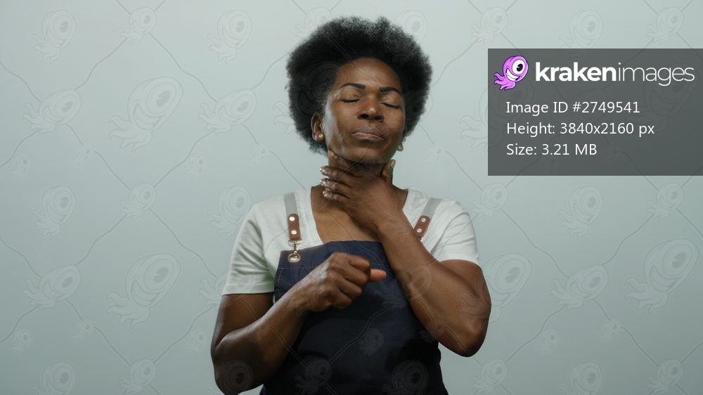 Woman coughing with hand on chest isolated against white background wearing apron in health context