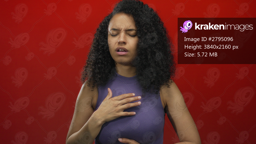 Woman coughing with hand on stomach against a solid red background, expressing discomfort and illness, suggesting need for medical attention and health awareness. - Kraken Images