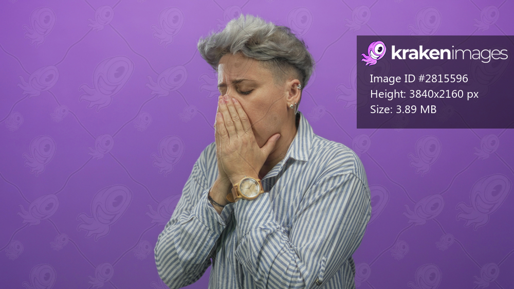 Woman coughing with hand to mouth in studio by purple wall wearing striped shirt; discomfort.