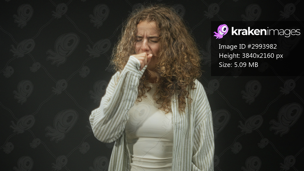 Woman coughing with hand to mouth in studio wearing striped shirt and white tank top; fatigue illness discomfort.