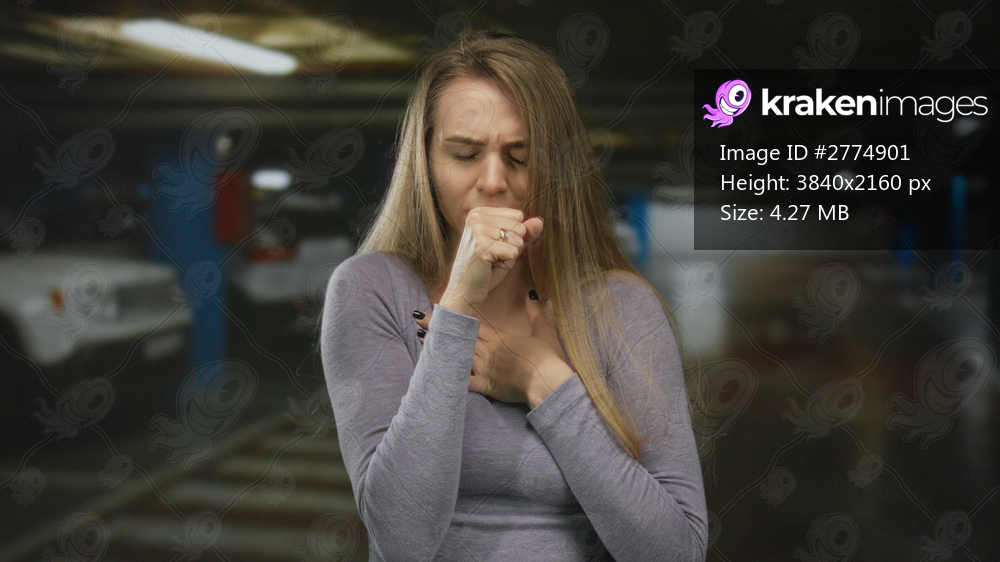Woman coughing in a dimly lit indoor parking lot with cars in the background, wearing a casual gray outfit, indicating distress or illness.