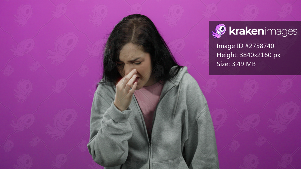 Woman coughing in casual gray hoodie against vibrant pink background, expressing discomfort and illness with a thoughtful pose and closed eyes.