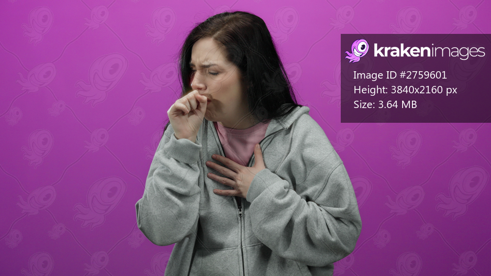 Woman coughing in casual gray hoodie against vibrant pink background, expressing discomfort and illness with a thoughtful pose and closed eyes.