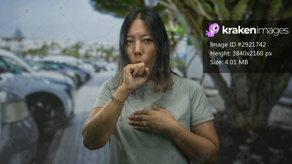 Woman coughing into fist with hand on chest on a city street near parked cars, expressive face and visible forearm; illness concern.