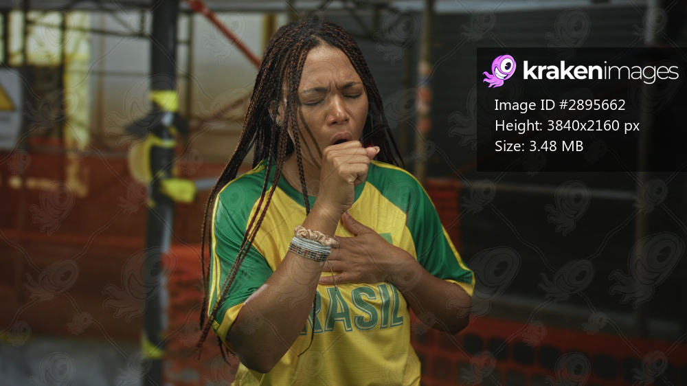 Woman coughing into fist with hand on chest, wearing yellow brasil jersey amid building scaffolding and orange safety fence; distress health concern.