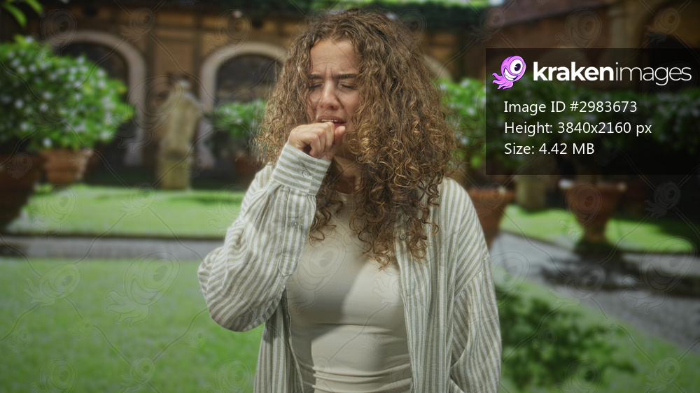 Woman coughing into hand in building courtyard, hand to mouth gesture, curly hair and casual cardigan visible; concern recovery.