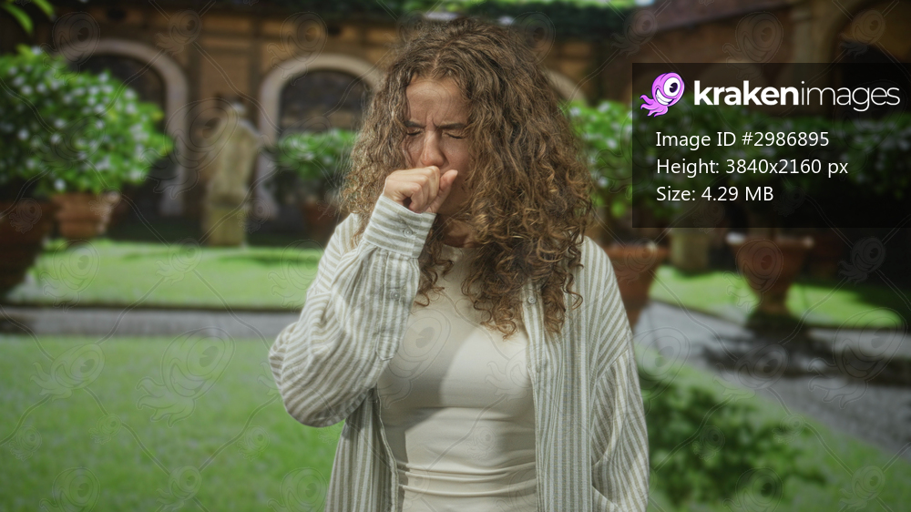 Woman coughing into hand in building courtyard, hand to mouth gesture, curly hair and casual cardigan visible; concern recovery.