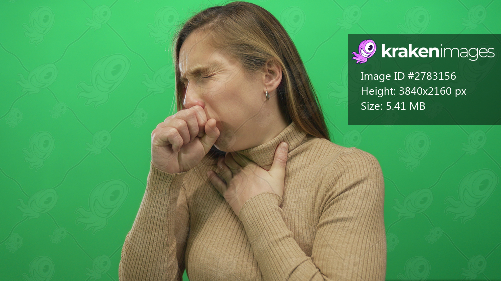 Woman coughing into her fist while standing against an isolated green wall wearing a beige sweater expressing illness or discomfort with eyes closed and hand on throat. - Kraken Images