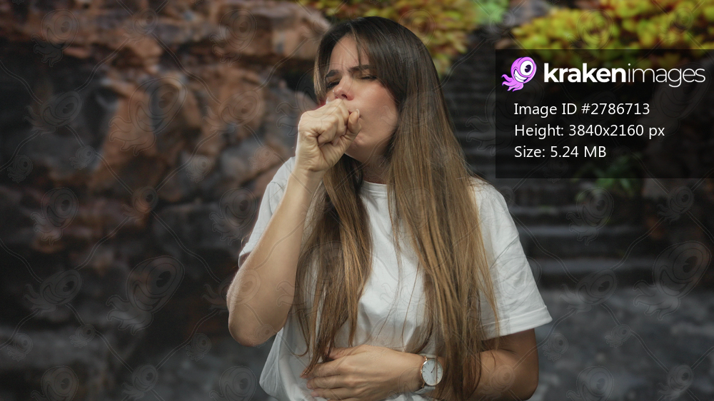 Woman coughing on city street in outdoor setting looking uncomfortable wearing casual white attire amid urban environment with stone backdrop and green foliage. - Kraken Images