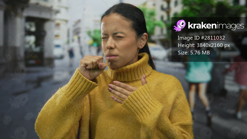 Woman coughing on city street wearing yellow sweater outdoors in urban environment capturing health moment.