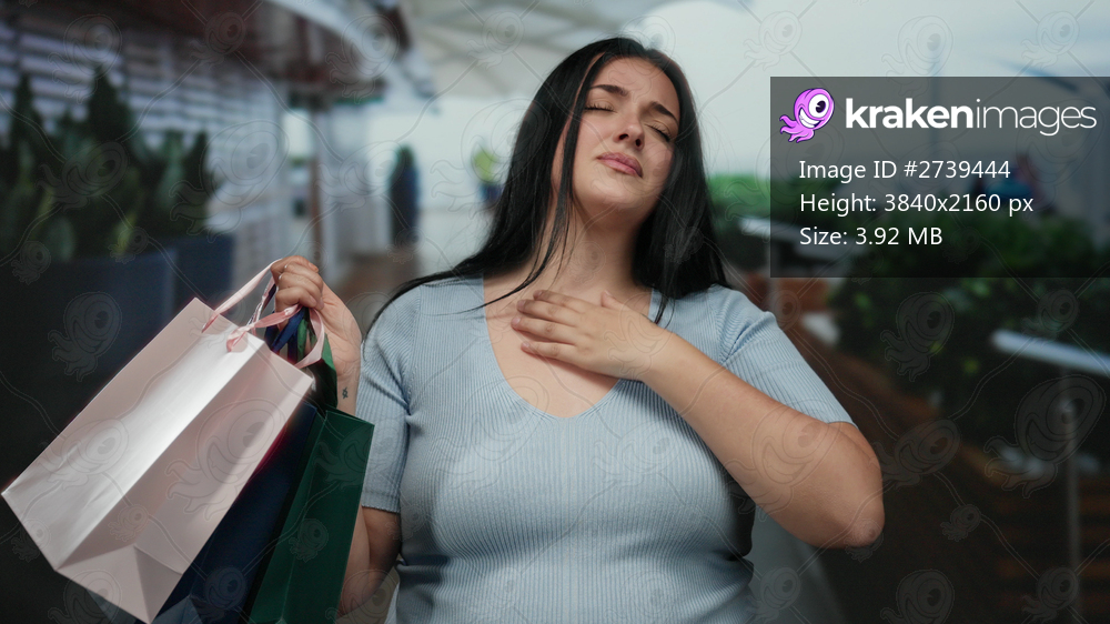 Woman coughing outdoors in a city while carrying shopping bags, looking distressed, wearing a light blue top, long black hair, plus size, curvy, standing on a street. - Kraken Images