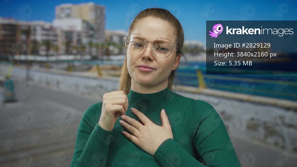 Woman coughs and clutches chest for heartattack on street wearing green sweater and glasses; distress illness.