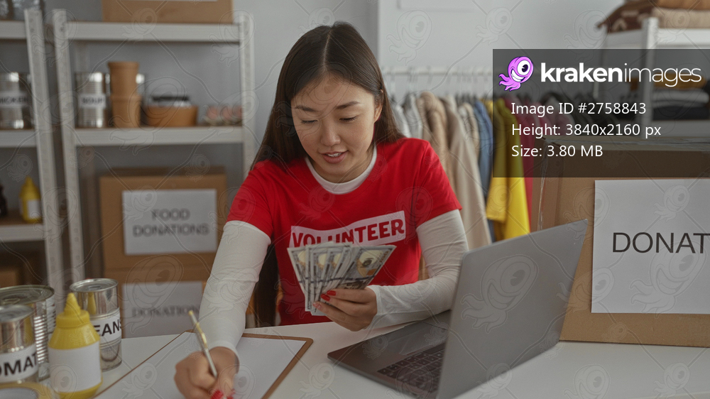 Woman counting american dollars in a charity donation center with food supplies organized on shelves.