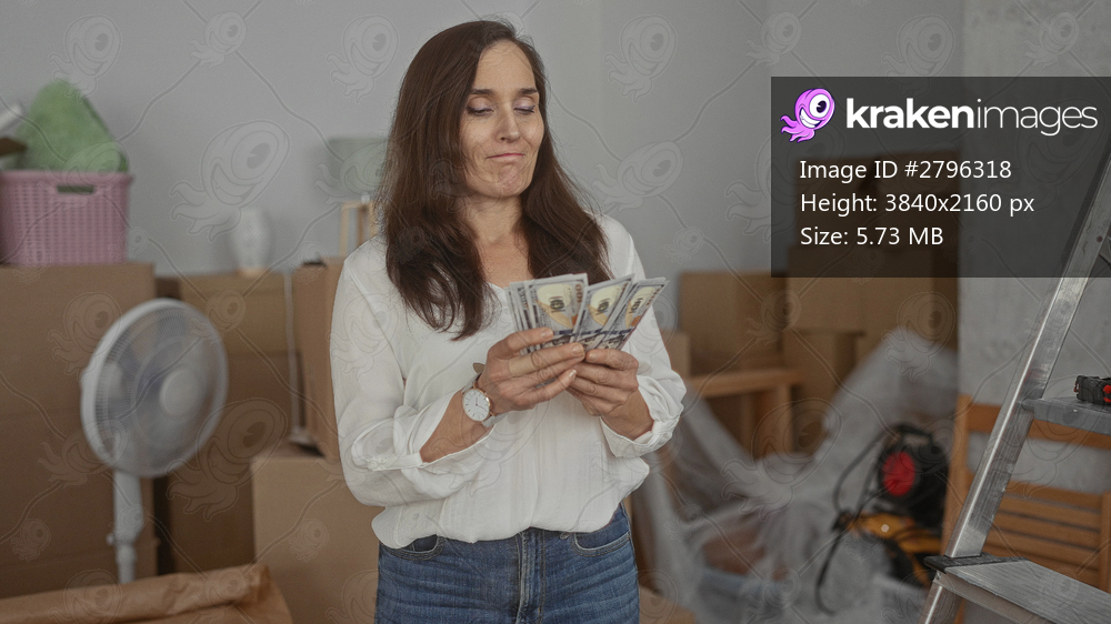 Woman counting american dollars indoors surrounded by packed boxes suggesting moving into a new home with unpacked items scattered around the room.