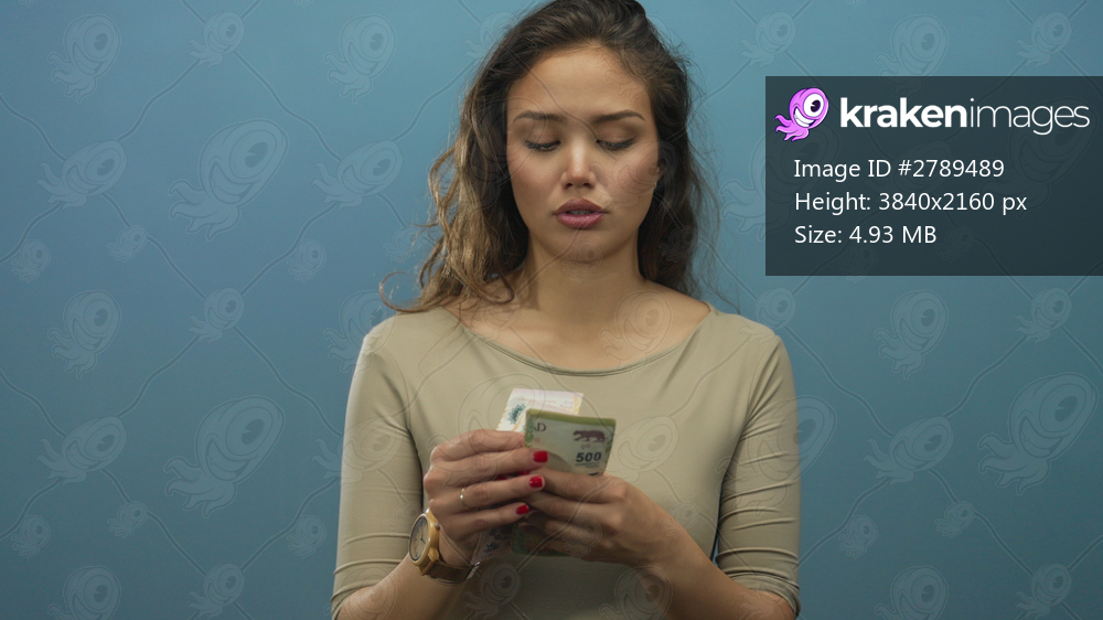 Woman counting argentinian pesos with an uncertain expression against blue background highlights financial concern and economic context.