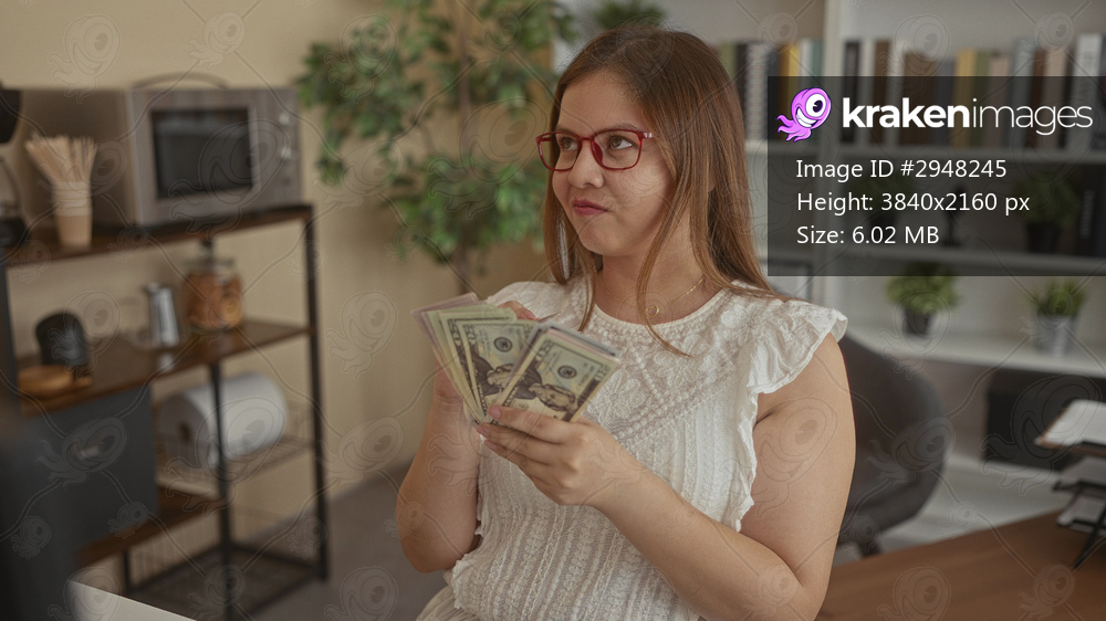 Woman counting cash in office, holding fanned us dollars and looking at bills while seated at desk near bookshelf and plant; budgeting calm.