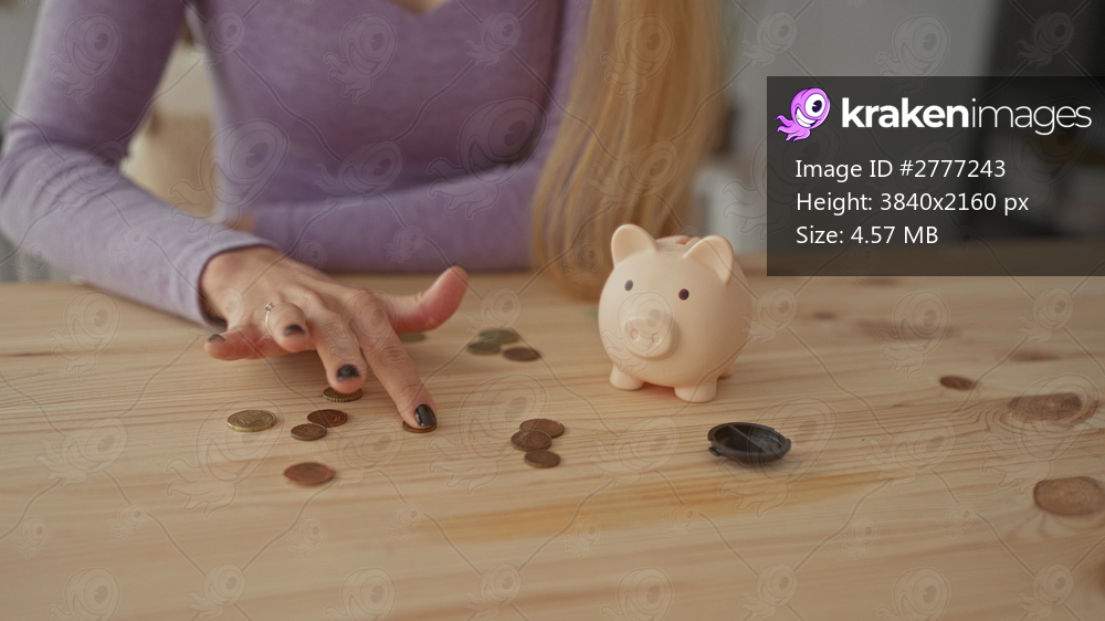 Woman counting coins next to piggy bank in cozy apartment, emphasizing saving money indoors with attentive hands in warm living room setting.