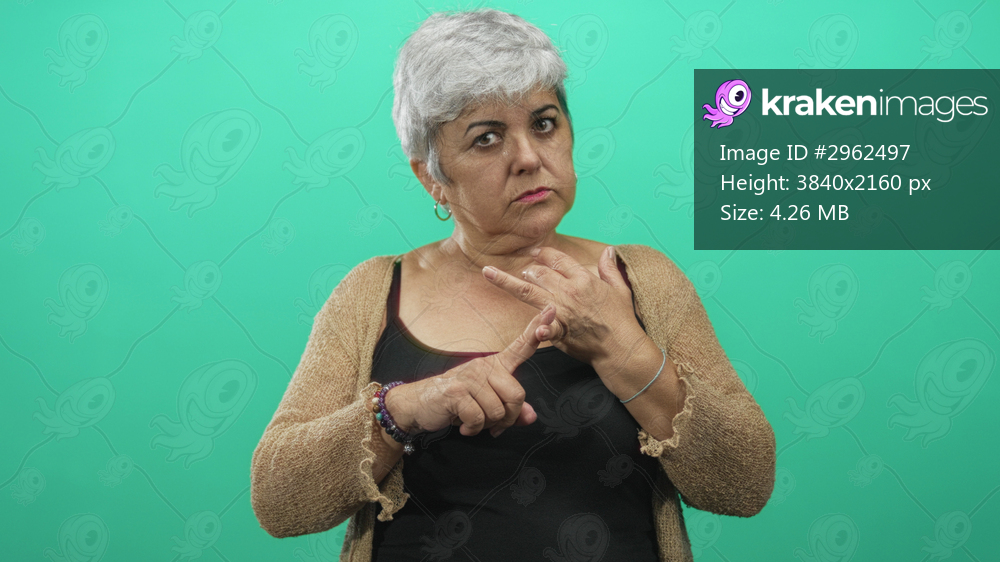 Woman counting fingers with index pointing wearing cardigan in studio green screen backdrop; thoughtful reflection.