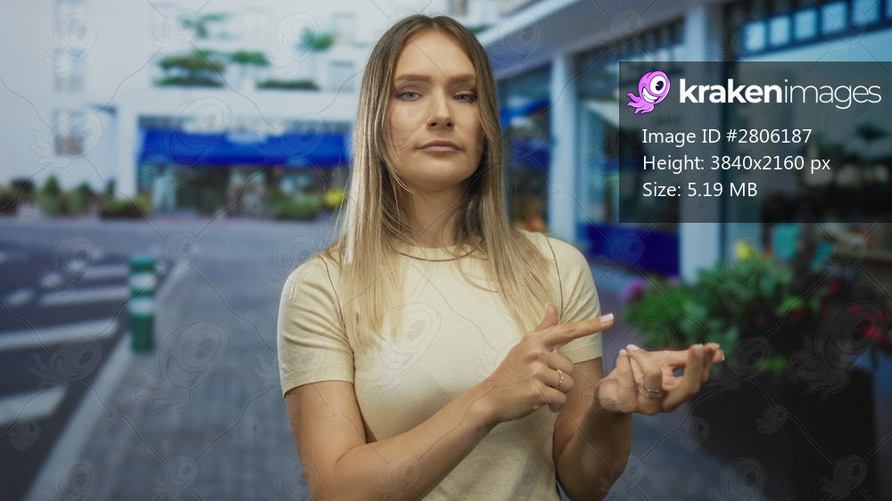 Woman counting with fingers outdoors on a city street, embodying thoughtful expression and urban setting, showcasing focus and concentration in a modern environment. - Kraken Images