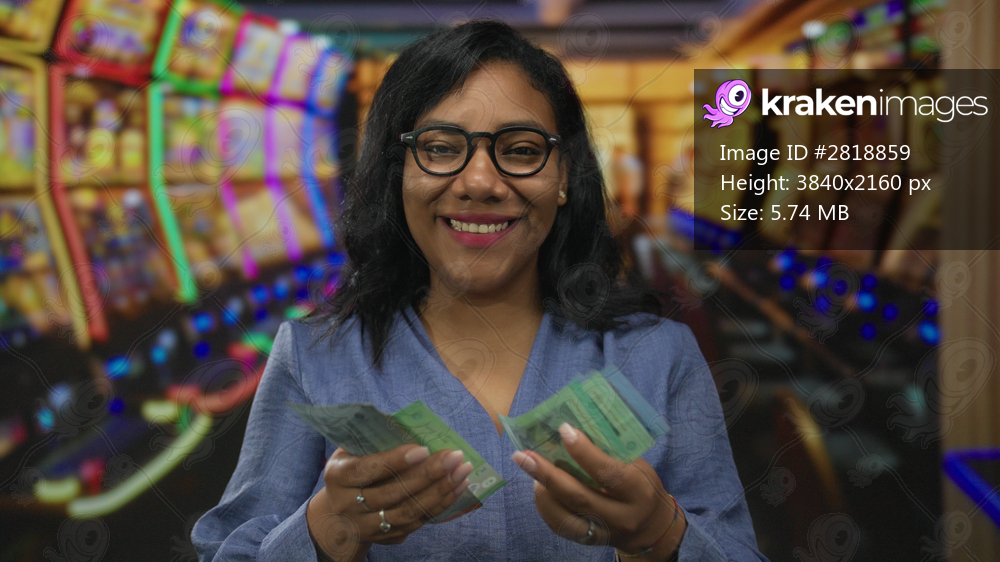 Woman counting malaysian ringgit banknotes inside casino building with focused smile; prosperity.