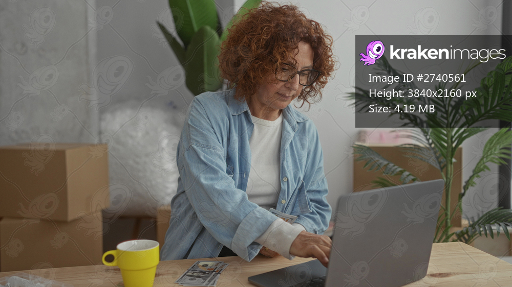 Woman counting money in living room with laptop and coffee surrounded by moving boxes suggesting new home setting.