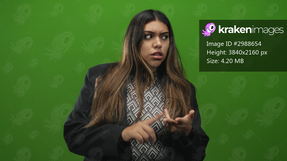 Woman counting on fingers and pointing with right hand in green screen studio, long hair and patterned blouse visible; uncertainty.