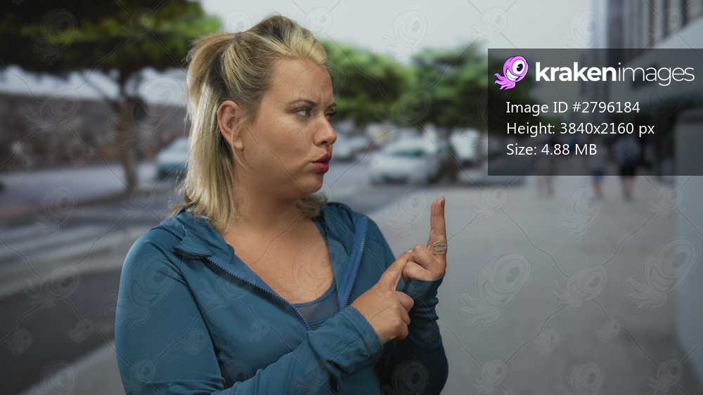 Woman counting on fingers with pursed lips while looking sideways in a blue jacket on street; concentration planning calculation focus.