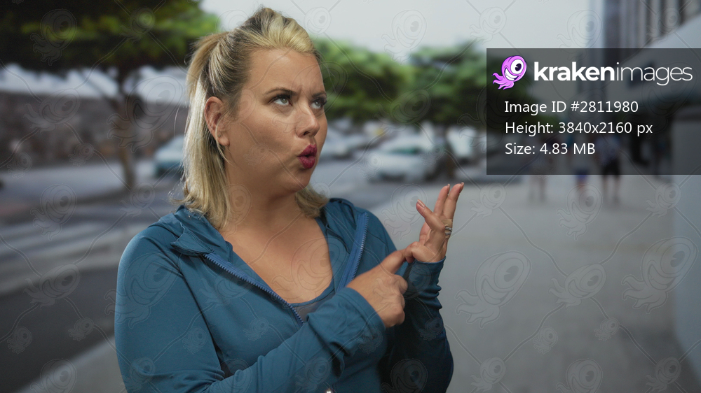 Woman counting on fingers with pursed lips while looking sideways in a blue jacket on street; concentration planning calculation focus.