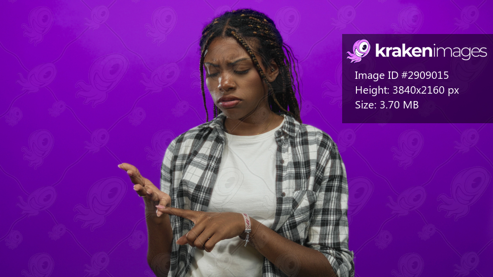 Woman counting and pointing at her fingers in studio with purple backdrop, wearing a plaid shirt and white tee; confusion.