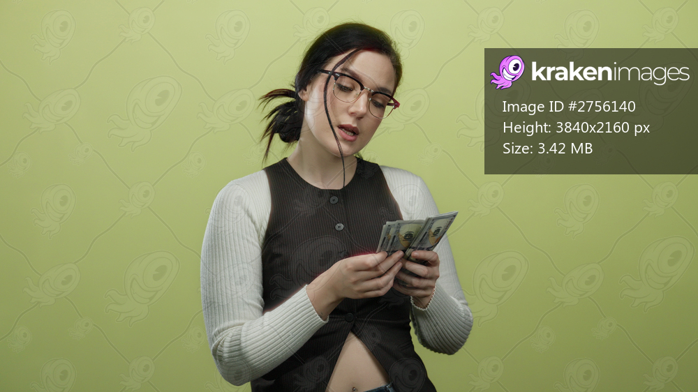 Woman counting us dollars with focused expression against yellow background, wearing glasses and casual attire, implying financial decisions or budgeting. - Kraken Images
