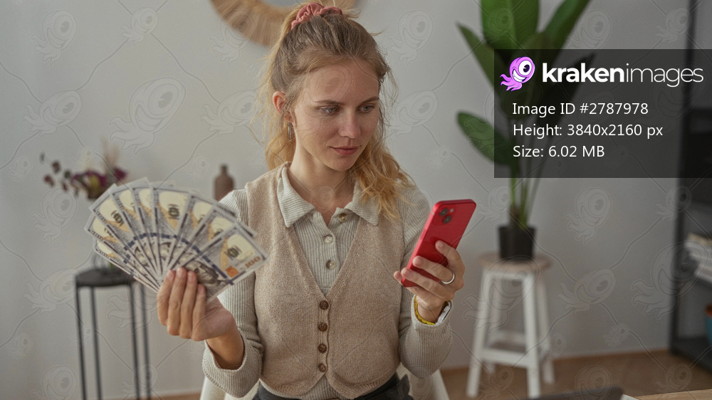 Woman counts dollars while holding smartphone, and blonde young influencer shows cash on a laptop in an office at home.