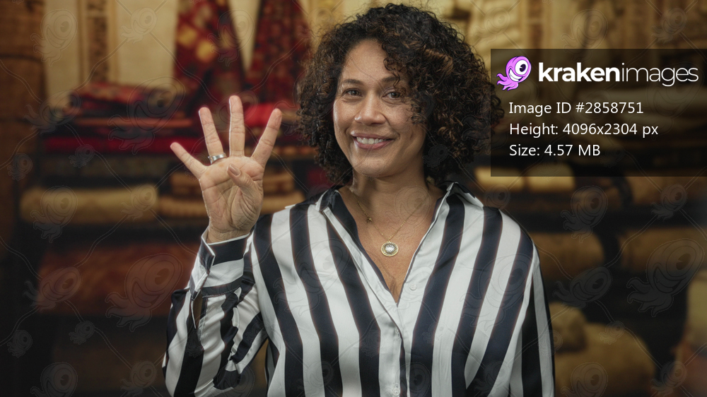 Woman counts on her fingers and holds up an open hand showing five among stacked carpet rolls in a shop interior; friendly greeting.