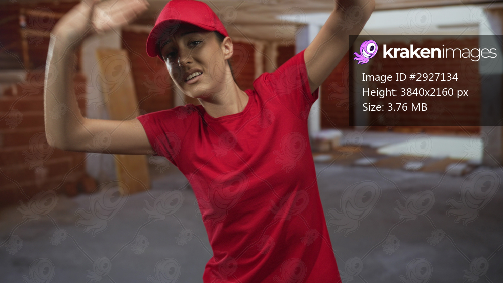Woman courier with hands raised in building under construction, wearing red cap and shirt; service frustration.