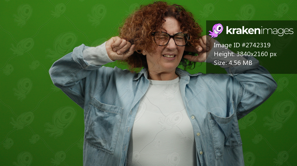 Woman covering ears with fingers in front of green background, showcasing a middle-aged hispanic appearance with curly hair and glasses, expressing irritation in a casual setting. - Kraken Images