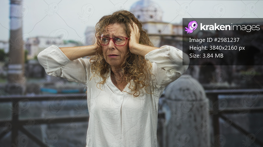 Woman covering ears with hands by stone railing in building ruins wearing red glasses and white blouse; anxiety.