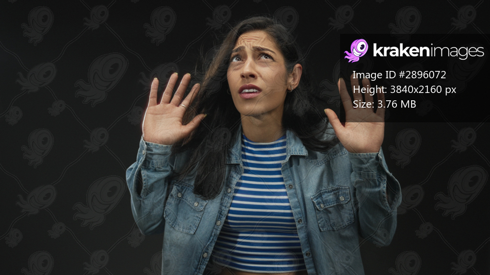 Woman covering ears with hands in studio against black backdrop wearing striped top and denim jacket; sensory overload distress.