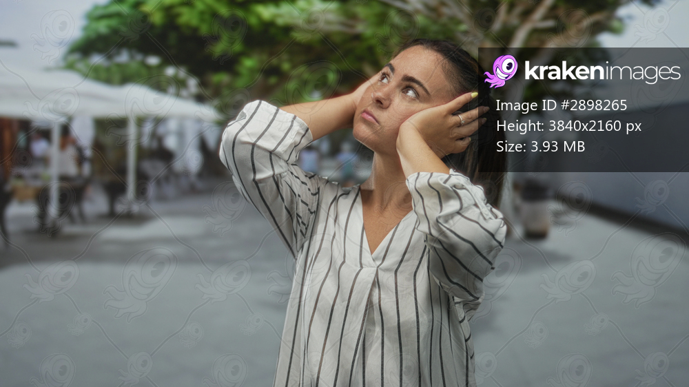Woman covering ears with hands and looking upward on street beside outdoor cafe and trees; silent frustration.
