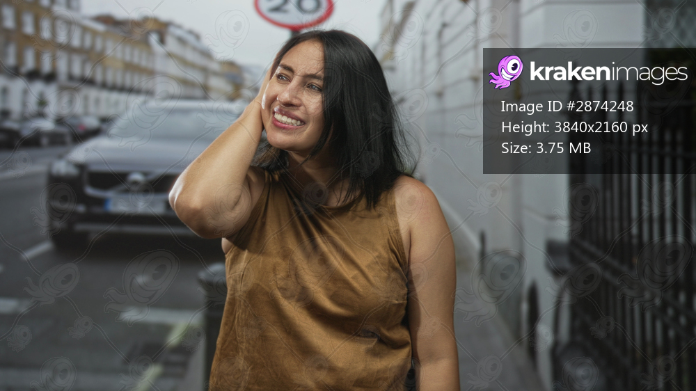 Woman covering ears with hands on a city street near parked car and wrought iron fence, bare shoulders visible; annoyance noise.