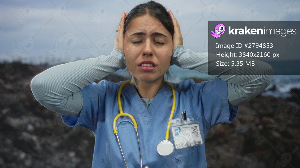 Woman covering ears with hands on beach wearing medical uniform and stethoscope visible; noise stress.