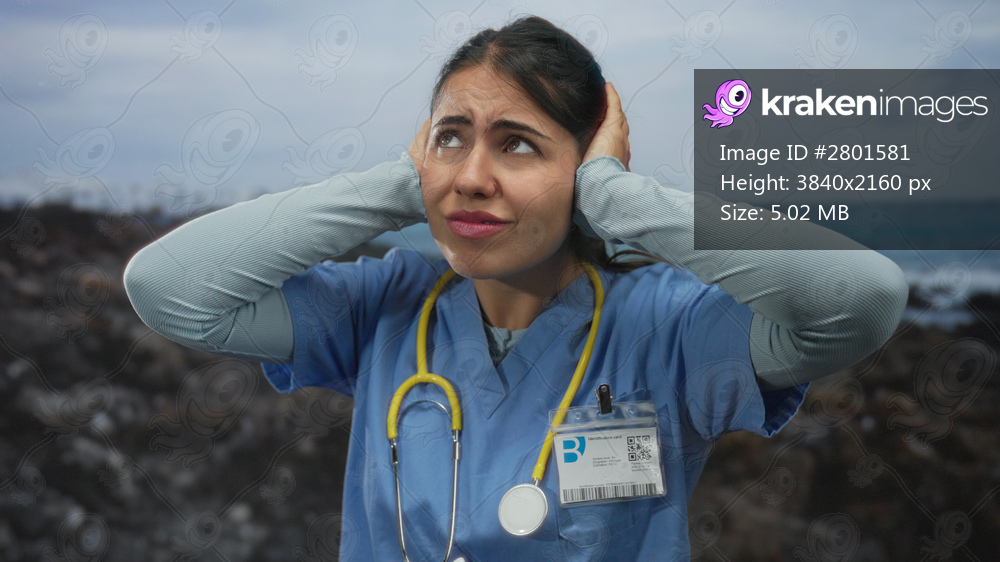 Woman covering ears with hands on beach wearing medical uniform and stethoscope visible; noise stress.