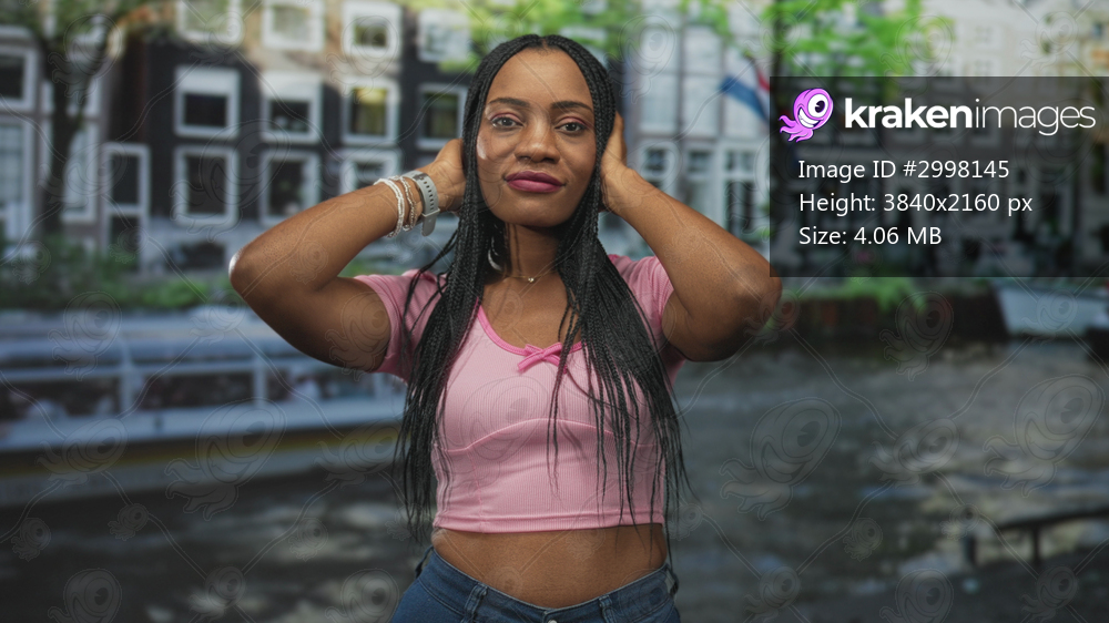 Woman covering ears with hands on canal street by historic buildings and tour boat near trees and flag; calm solitude.