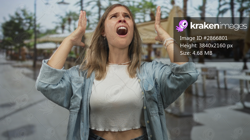Woman covering ears with hands on street terrace outside restaurant, midriff and bracelets visible, fists tense near head; stress coping.