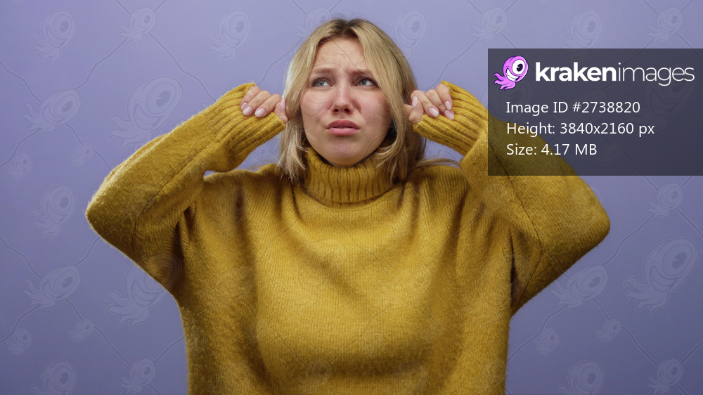 Woman covering ears in frustration against isolated purple background wearing mustard sweater showing discomfort with noise in a serious expression.