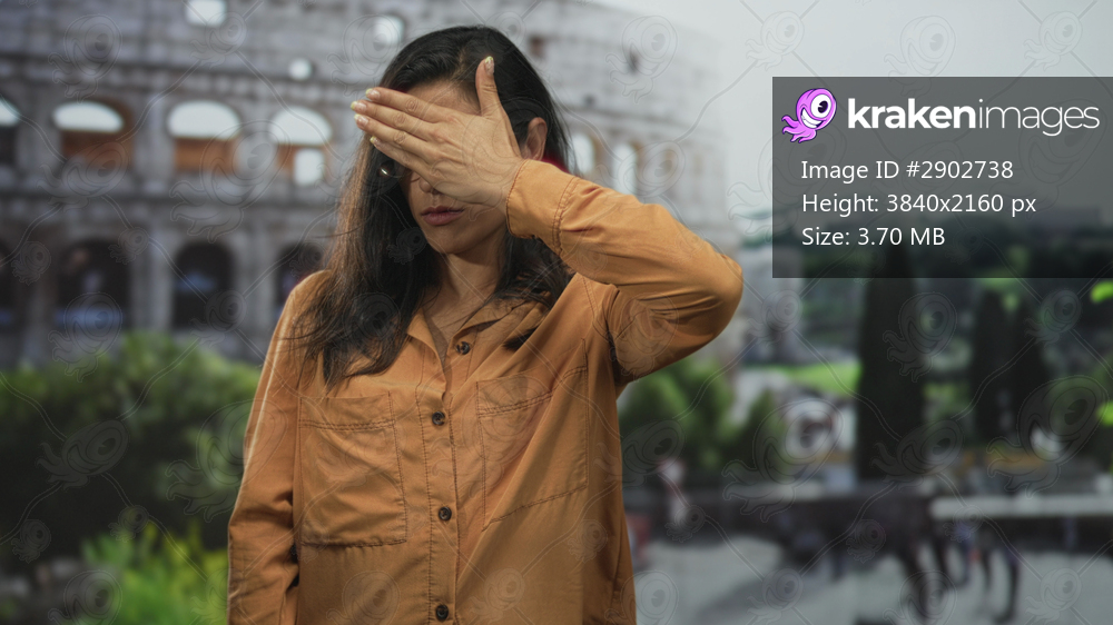 Woman covering eyes with hand at roman coliseum building, wearing orange shirt and glasses showing discomfort; introspection privacy.