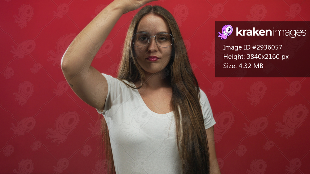 Woman covering eyes with hand in red studio wearing white t shirt and glasses, long hair visible; playful confidence.